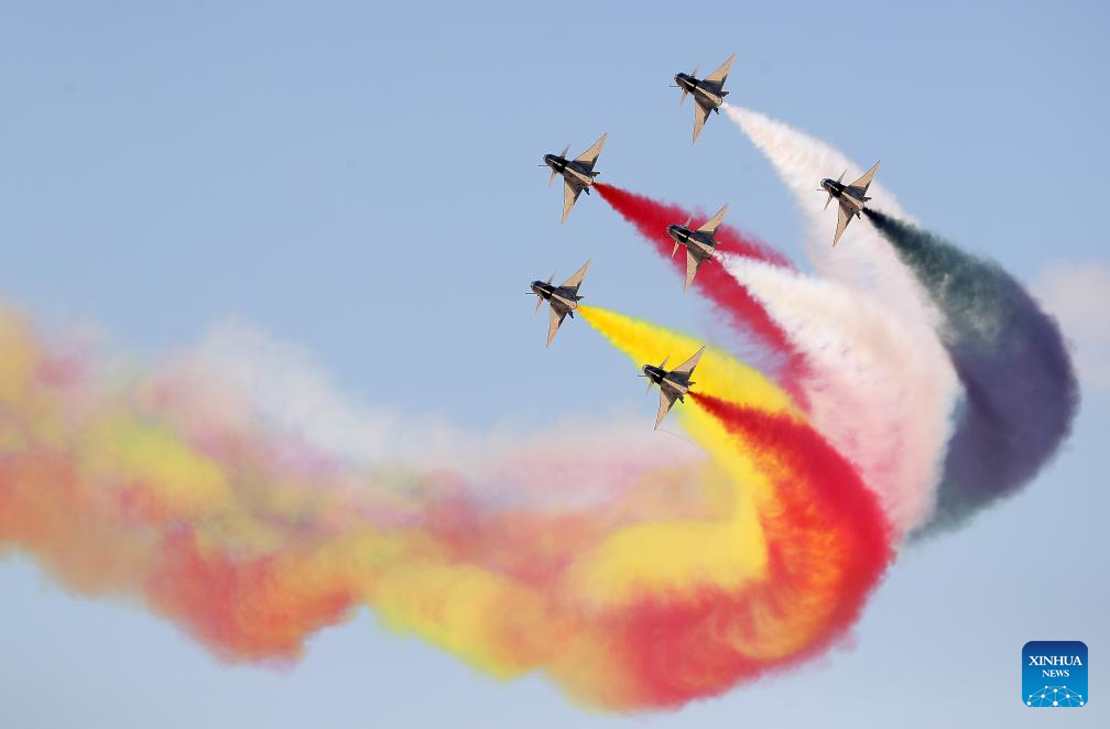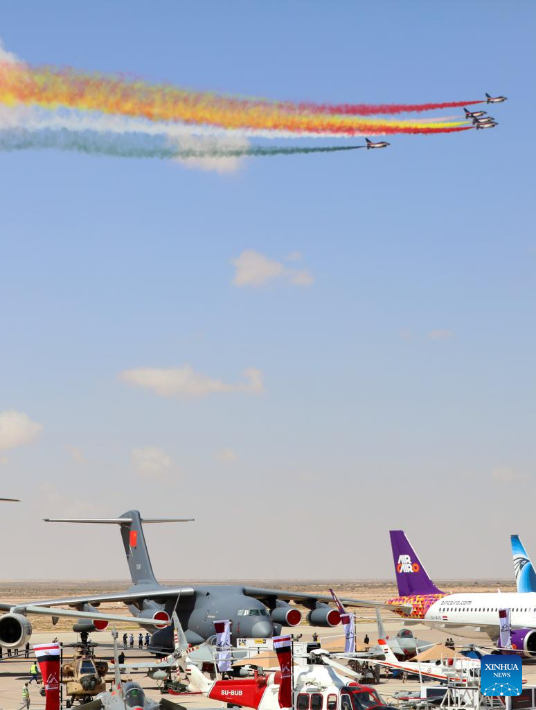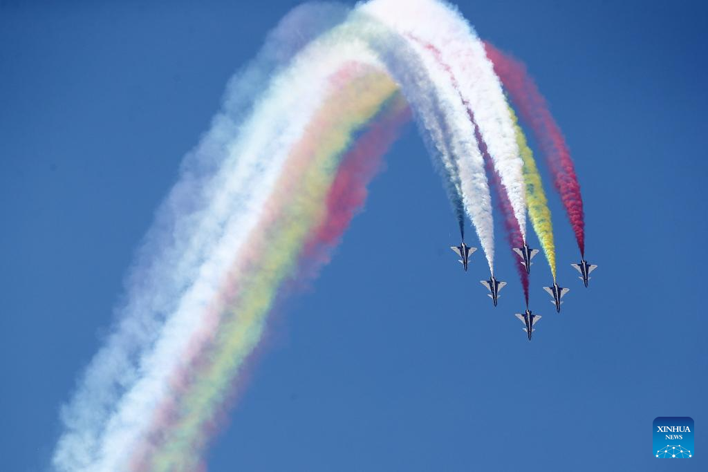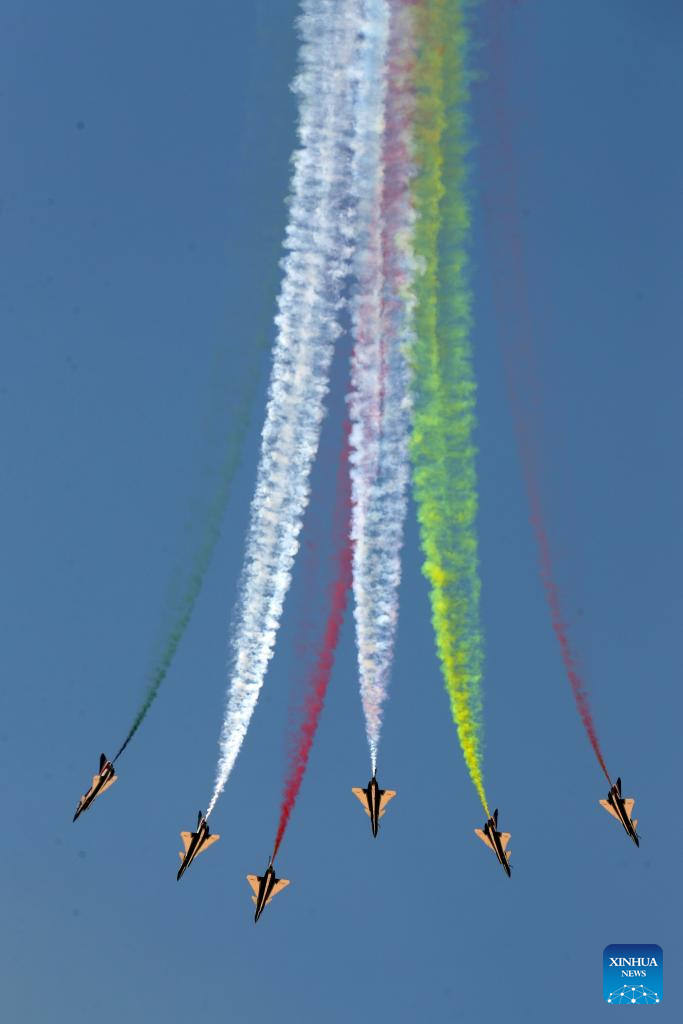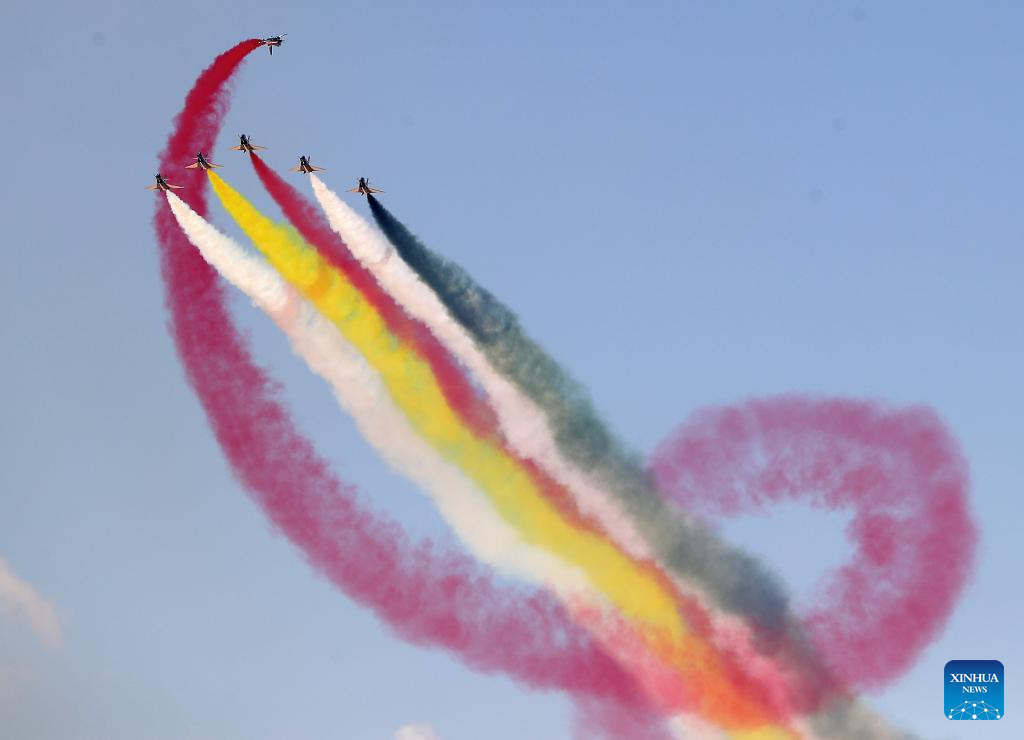 The Chinese People's Liberation Army (PLA) Air Force's August 1st aerobatics team performs during the first edition of the Egypt International Airshow at El Alamein International Airport in El Dabaa, Egypt, Sept. 4, 2024. The first edition of the Egypt International Airshow kicked off on Tuesday at a northern airport in the country, with flight performances by air forces from Egypt, China, and other countries. (Xinhua/Wang Dongzhen)