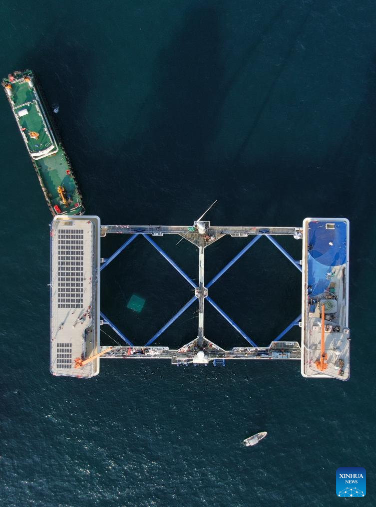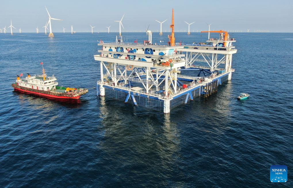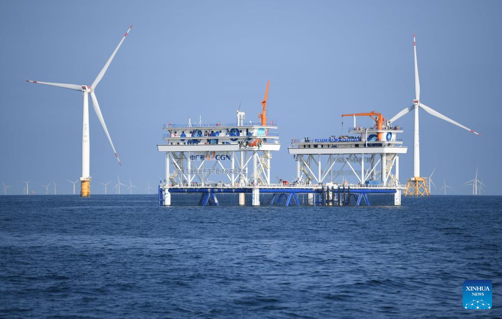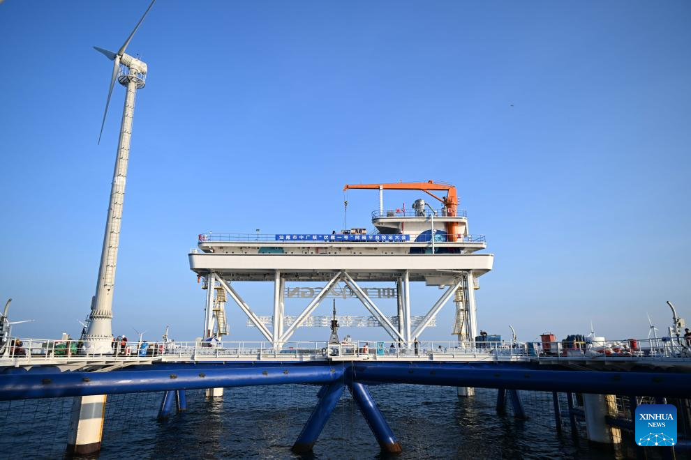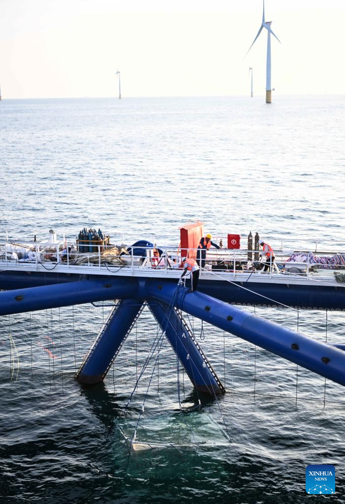 China General Nuclear Power Corporation (CGN)'s "Fuxi No. 1" wind power-fishery integrated project is seen in Shanwei, south China's Guangdong Province, Sept. 2, 2024. Using green energy as its power supply, the marine ranch project started its operation in Shanwei on Sept. 4. It is expected to produce 900 tonnes of high-quality marine fish annually. (Xinhua/Deng Hua)
