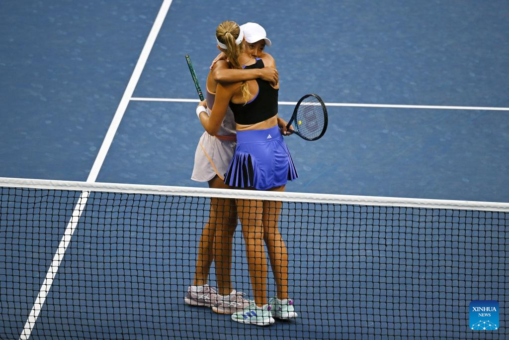 Zhang Shuai (R) and Kristina Mladenovic celebrate after the women's semi-final match between Zhang Shuai of China/Kristina Mladenovic of France and Katerina Siniakova of the Czech Republic/Taylor Townsend of the United States at the 2024 US Open tennis championships in New York, the United States, Sept. 4, 2024. (Xinhua/Li Rui)