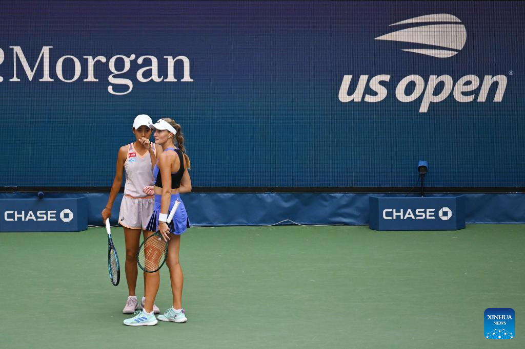 Zhang Shuai (L) and Kristina Mladenovic communicate during the women's semi-final match between Zhang Shuai of China/Kristina Mladenovic of France and Katerina Siniakova of the Czech Republic/Taylor Townsend of the United States at the 2024 US Open tennis championships in New York, the United States, Sept. 4, 2024. (Xinhua/Li Rui)