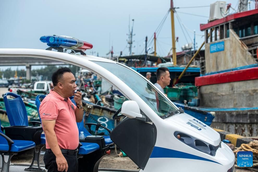 A staff member makes an emergency call to remind the fishermen to make preparations for the typhoon in Tanmen township of Qionghai, south China's Hainan Province, Sept. 5, 2024. The State Flood Control and Drought Relief Headquarters raised its emergency response for flood and typhoon prevention from level III to level II in Guangdong and Hainan provinces at 3 p.m. Thursday, as typhoon Yagi approaches.