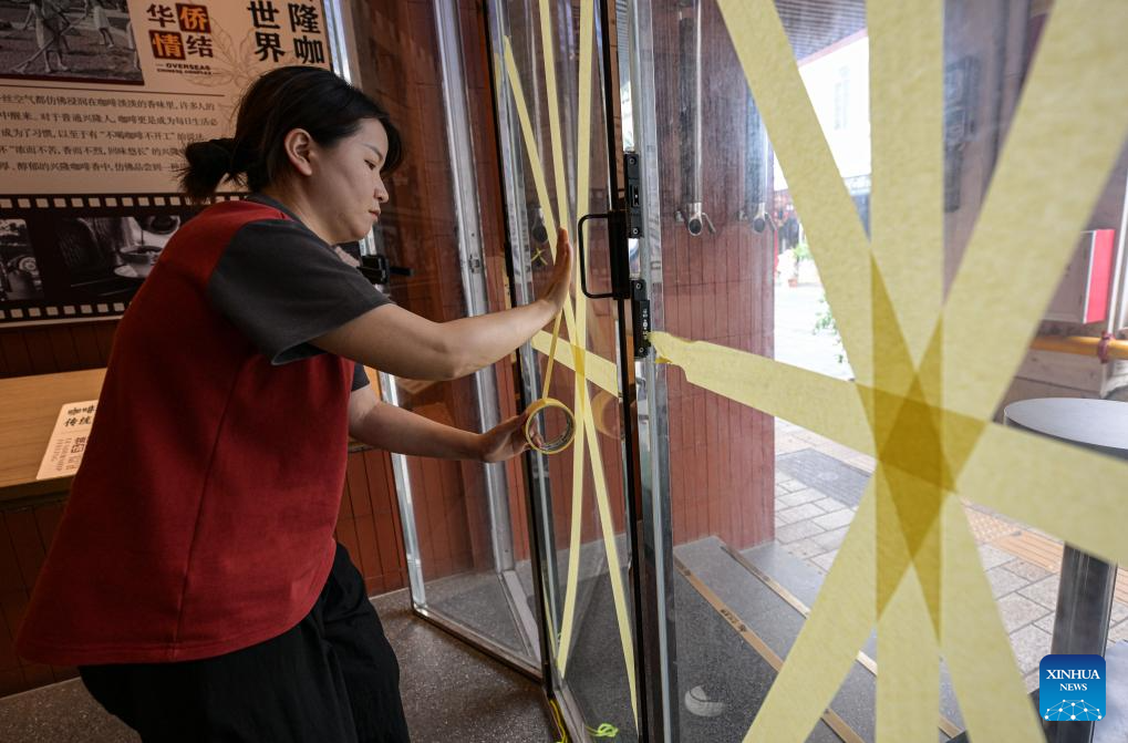 A staff member of a cafe reinforces a glass window in Haikou, south China's Hainan Province, Sept. 5, 2024. The State Flood Control and Drought Relief Headquarters raised its emergency response for flood and typhoon prevention from level III to level II in Guangdong and Hainan provinces at 3 p.m. Thursday, as typhoon Yagi approaches.