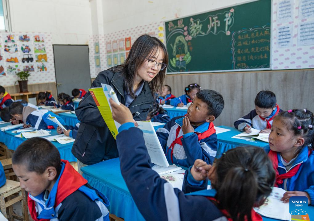 A volunteer teacher from Lingnan Normal University in Guangdong gives a lesson at the Central Primary School in Nyangpo Township, Gongbo'Gyamda County, Nyingchi City, southwest China's Xizang Autonomous Region, Sept. 3, 2024.(Xinhua/Tenzin Nyida)