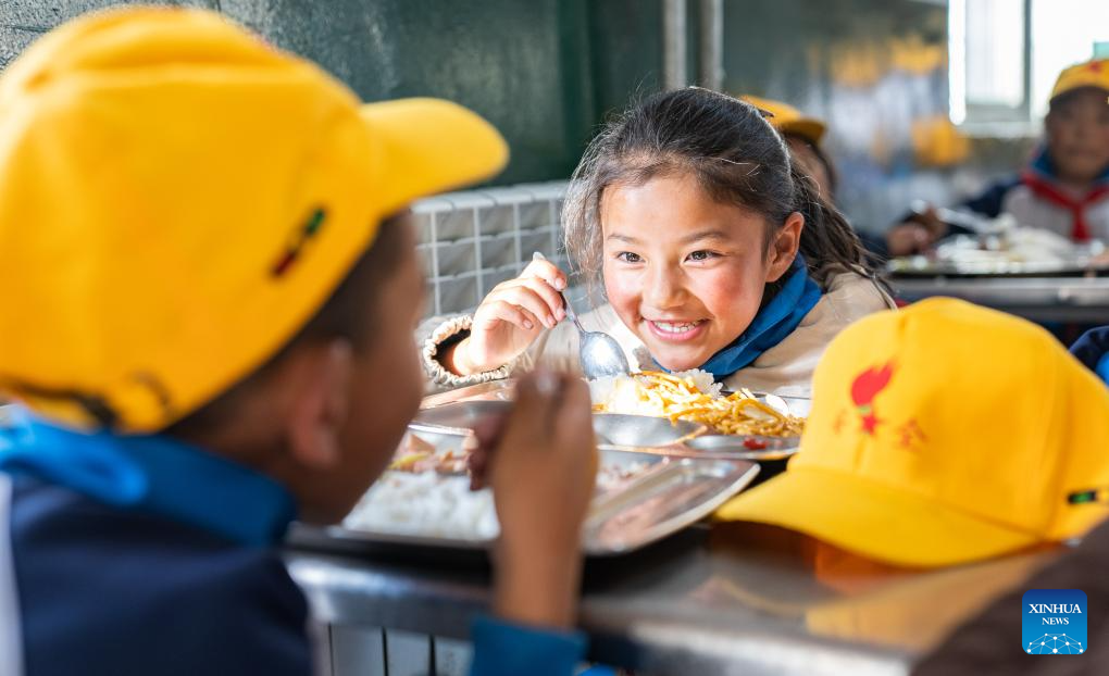 Students have meals at the canteen of the Central Primary School in Nyangpo Township, Gongbo'Gyamda County, Nyingchi City, southwest China's Xizang Autonomous Region, Sept. 3, 2024. (Xinhua/Jigme Dorje)