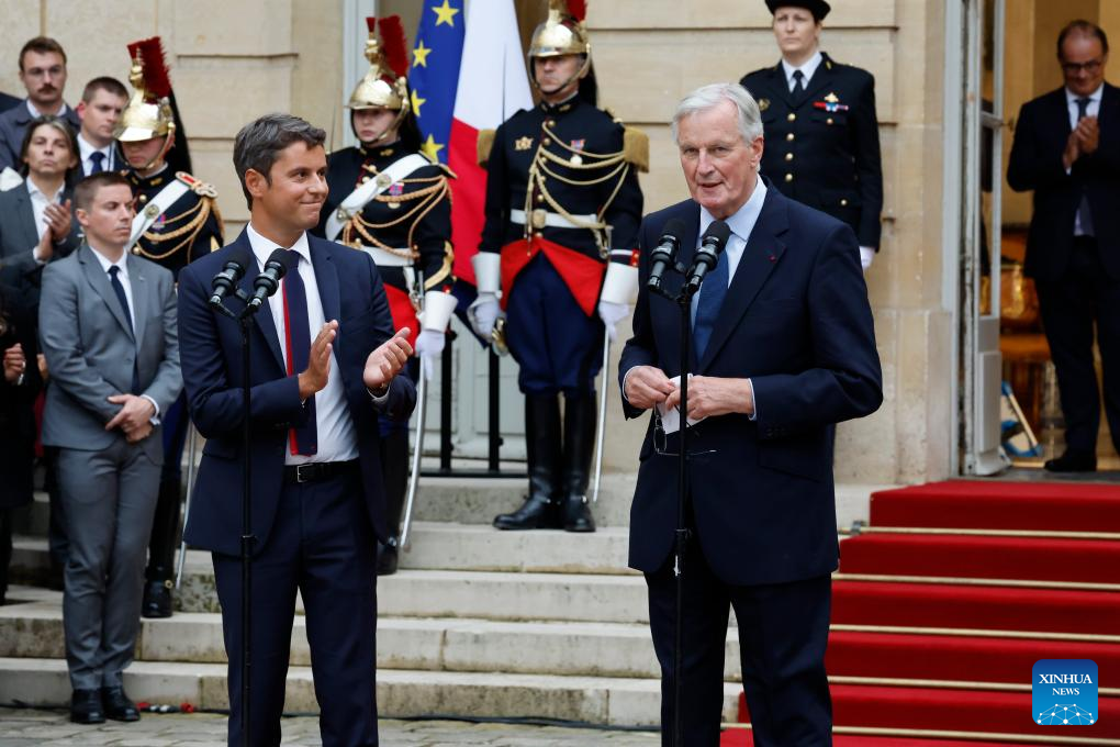 Newly appointed Prime minister Michel Barnier (R, Front) attends a handover ceremony at the Hotel Matignon in Paris, France, on Sept. 5, 2024. French President Emmanuel Macron has nominated former Brexit negotiator Michel Barnier as the new prime minister, the Elysee announced on Thursday. (Photo by Henri Szwarc/Xinhua)