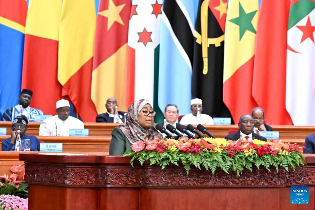Tanzanian President Samia Suluhu Hassan addresses the opening ceremony of the 2024 Summit of the Forum on China-Africa Cooperation (FOCAC) at the Great Hall of the People in Beijing, capital of China, Sept. 5, 2024. The 2024 Summit of the FOCAC opened here on Thursday. (Xinhua/Yan Yan)