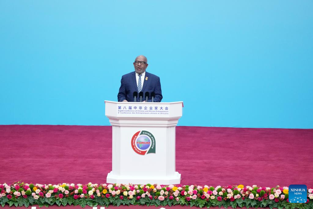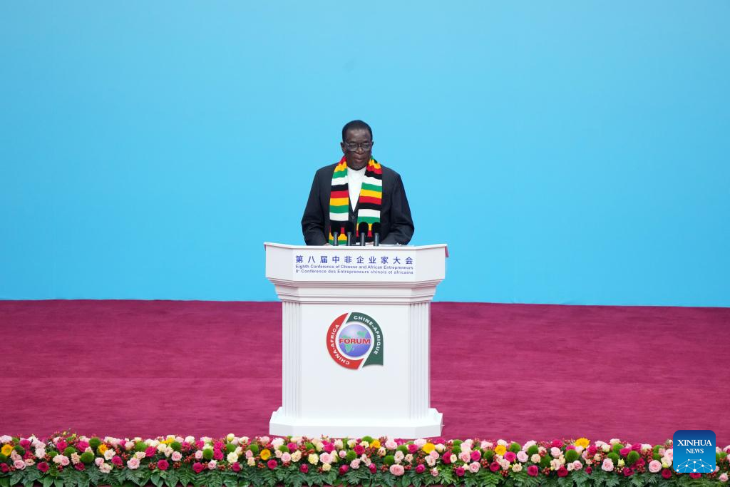 Zimbabwean President Emmerson Mnangagwa gives a speech at the opening ceremony of the eighth Conference of Chinese and African Entrepreneurs at the China National Convention Center in Beijing, capital of China, Sept. 6, 2024. (Xinhua/Chen Yehua)