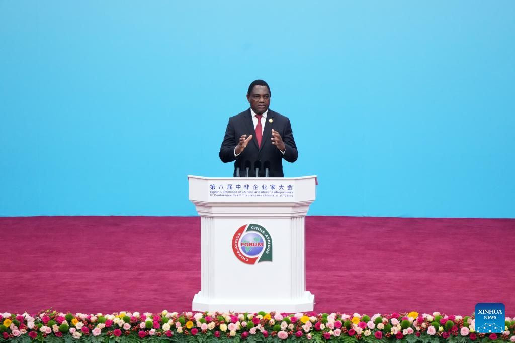 Zambian President Hakainde Hichilema gives a speech at the opening ceremony of the eighth Conference of Chinese and African Entrepreneurs at the China National Convention Center in Beijing, capital of China, Sept. 6, 2024. (Xinhua/Chen Yehua)