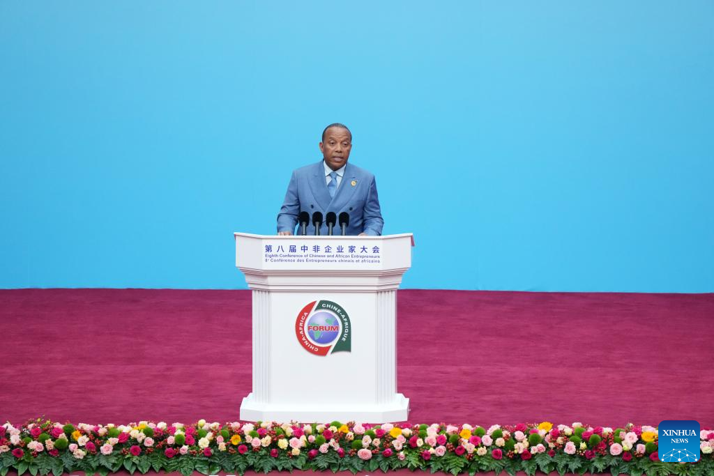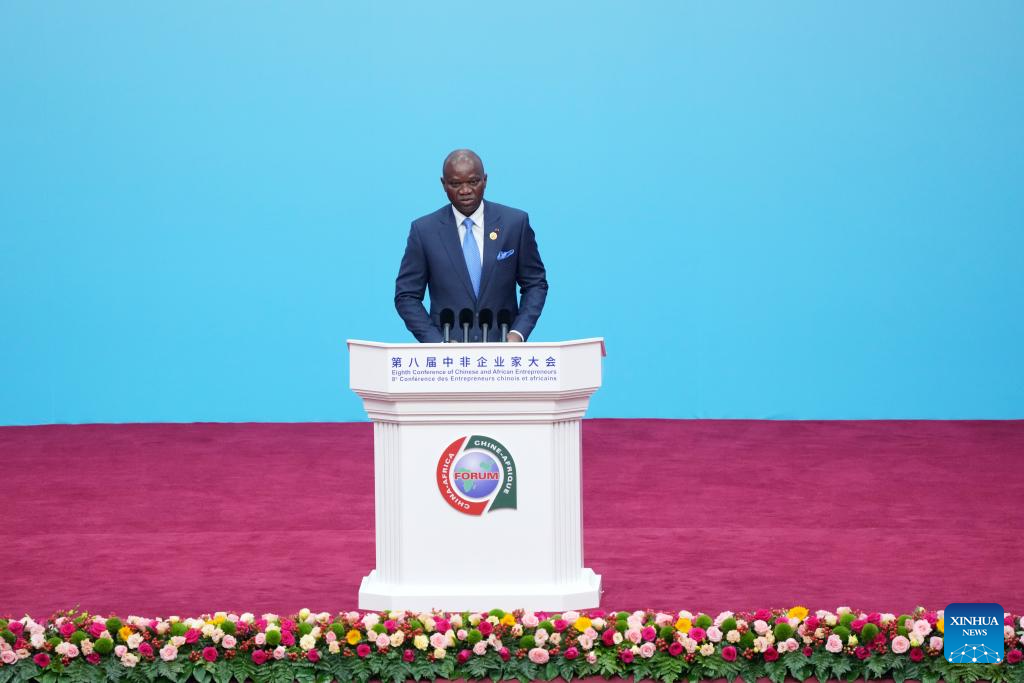 Gabonese President Brice Clotaire Oligui Nguema gives a speech at the opening ceremony of the eighth Conference of Chinese and African Entrepreneurs at the China National Convention Center in Beijing, capital of China, Sept. 6, 2024. (Xinhua/Chen Yehua)