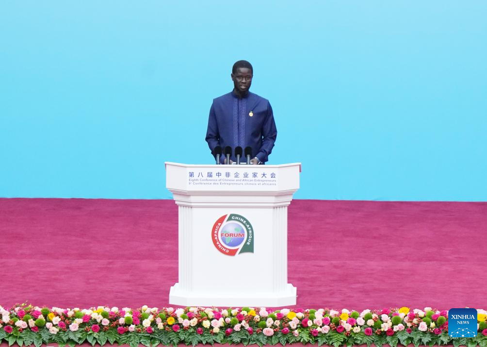 Senegalese President Bassirou Diomaye Faye gives a speech at the opening ceremony of the eighth Conference of Chinese and African Entrepreneurs at the China National Convention Center in Beijing, capital of China, Sept. 6, 2024. (Xinhua/Chen Yehua)