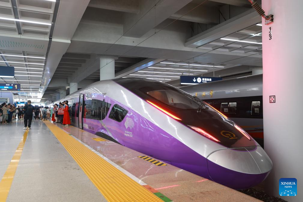 The bullet train No. G9505 is pictured at Hangzhouxi Railway Station ahead of its maiden trip on the Hangzhou-Wenzhou high-speed railway in Hangzhou, east China's Zhejiang Province, Sept. 6, 2024.