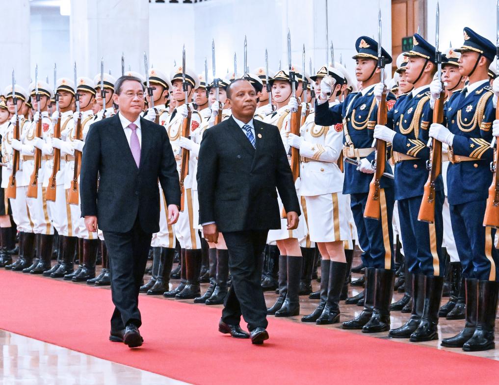 Chinese Premier Li Qiang holds a welcoming ceremony for Sao Tome and Principe's Prime Minister Patrice Trovoada, who is in Beijing for the 2024 Summit of the Forum on China-Africa Cooperation (FOCAC) and an official visit, at the Great Hall of the People prior to their talks in Beijing, capital of China, Sept. 6, 2024. Li held talks with Trovoada here on Friday. (Xinhua/Rao Aimin)