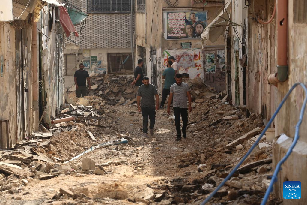 People are seen on a street destroyed in an Israeli military operation in the northern West Bank city of Jenin, on Sept. 6, 2024. The Israeli army withdrew from the West Bank city of Jenin on Friday after a 10-day operation that left 21 people dead, according to Palestinian and Israeli sources. (Photo by Nidal Eshtayeh/Xinhua)