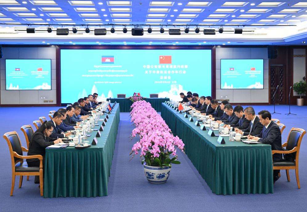 Chinese State Councilor and Minister of Public Security Wang Xiaohong co-chairs a wrap-up meeting of the Year of Law Enforcement Cooperation activities between China and Cambodia with Cambodian Deputy Prime Minister and Minister of Interior Sar Sokha in Beijing, capital of China, Sept. 6, 2024. (Xinhua/Li Xiang)