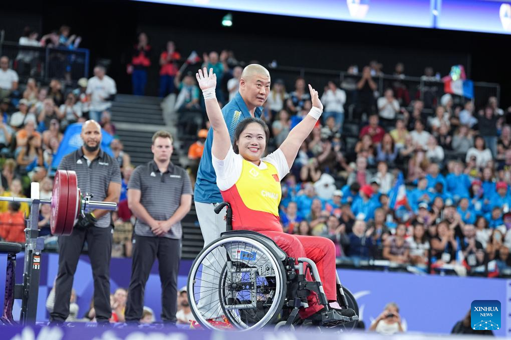Tan Yujiao of China celebrates during the para powerlifting women's up to 67kg final at the Paris 2024 Paralympic Games in Paris, France, Sept. 6, 2024. (Xinhua/Lian Yi)