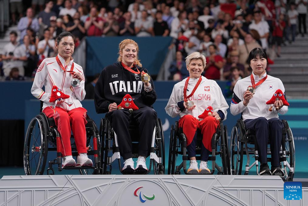(L to R) Silver medalist Liu Jing of China, gold medalist Giada Rossi of Italy and bronze medalists Dorota Buclaw of Poland and Seo Su Yeon of South Korea pose during the awarding ceremony for the Para Table Tennis women's singles WS1-2 event at the Paris 2024 Paralympic Games in Paris, France, Sept. 6, 2024. (Xinhua/Hou Zhaokang)