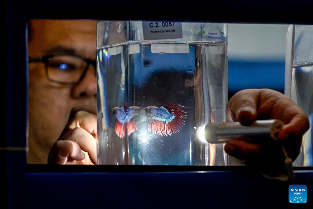 A person checks a siamese fighting fish during the Indonesia International Pet Expo 2024 at Indonesia Convention Exhibition (ICE) in Tangerang, Indonesia, Sept. 6, 2024. (Xinhua/Agung Kuncahya B.)