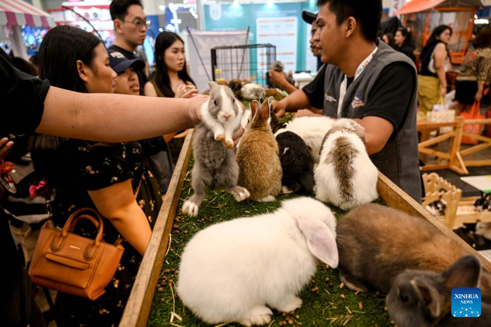 A visitor holds a rabbit during the Indonesia International Pet Expo 2024 at Indonesia Convention Exhibition (ICE) in Tangerang, Indonesia, Sept. 6, 2024. (Xinhua/Agung Kuncahya B.)