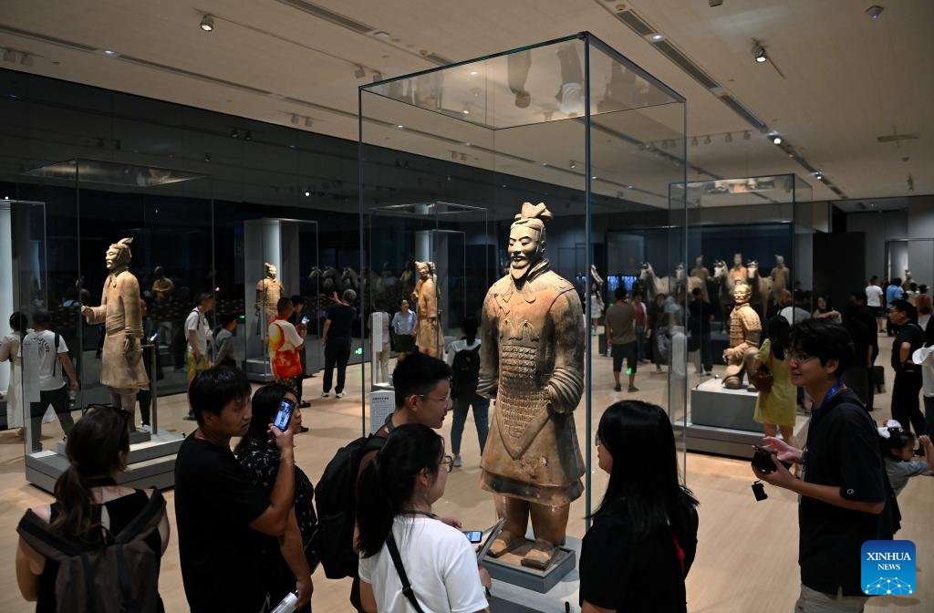 People visit an exhibition, commemorating the 50th anniversary of the discovery and excavation of the iconic Terracotta Warriors, at the Emperor Qinshihuang's Mausoleum Site Museum in Xi'an, capital of northwest China's Shaanxi Province, Sept. 8, 2024. The exhibition, which opened on Sunday, showcases 230 cultural relics in eight categories, many being revealed to the public for the first time, offering a glimpse into the era of Emperor Qinshihuang of the Qin Dynasty (221 BC-207 BC). (Xinhua/Li Yibo)