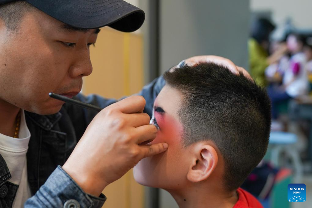 Zhou Jie, a full-time teacher of the "little Kunqu Opera training class," helps a pupil prepare the make-up before a performance at a training room of Shipai Center Primary School of Kunshan in Kunshan City, east China's Jiangsu Province, May 31, 2024. (Xinhua/Li Bo)