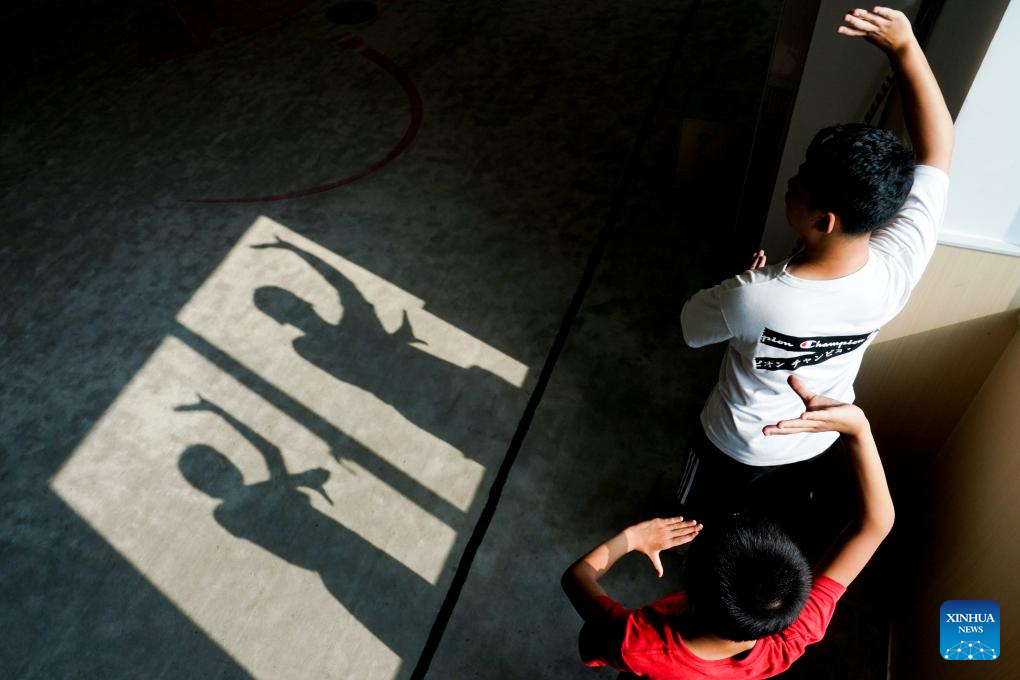 Xie Suqian (front), a pupil of the "little Kunqu Opera training class," practices under the full-time teacher Zhou Jie's guidance at Shipai Center Primary School of Kunshan in Kunshan City, east China's Jiangsu Province, May 26, 2024. (Xinhua/Li Bo)
