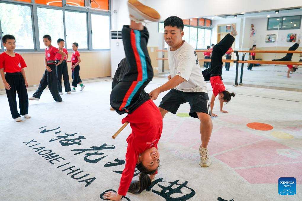 Zhou Jie, a full-time teacher of the "little Kunqu Opera training class," guides pupils at a training room of Shipai Center Primary School of Kunshan in Kunshan City, east China's Jiangsu Province, Sept. 6, 2024. (Xinhua/Li Bo)