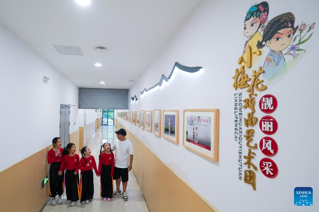Zhou Jie (1st R), a full-time teacher of the "little Kunqu Opera training class," and pupils head for a training session at Shipai Center Primary School of Kunshan in Kunshan City, east China's Jiangsu Province, May 30, 2024. (Xinhua/Li Bo)
