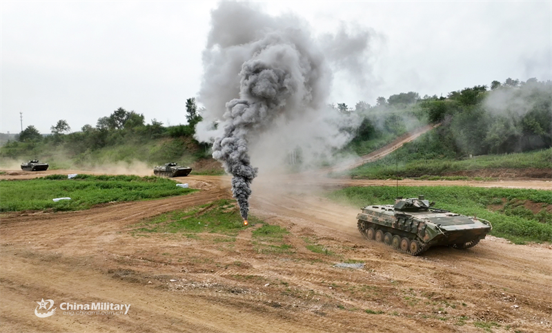 An armored vehicle attached to a brigade under the Chinese PLA 79th Group Army passes through the mock enemy's artillery barrage during a company-level tactic assessment in late July 2024. (eng.chinamil.com.cn/Photo by Wang Lijun)
