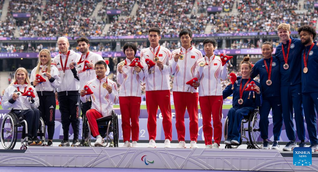 Gold medalist team China (C), silver medalist team Great Britain (L) and bronze medalist team USA pose for photograph during the awarding ceremony for the 4x100m Universal Relay final of Para Athletics at the Paris 2024 Paralympic Games in Paris, France, Sept. 7, 2024. (Xinhua/Cai Yang)