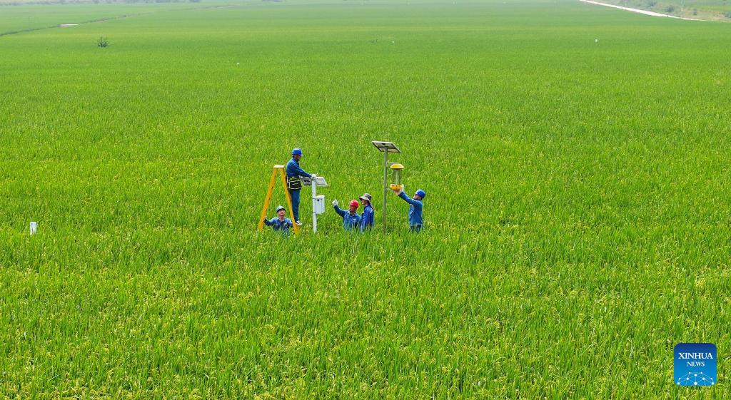 Engineers adjust an insect situation forecast instrument in Shiji Town of Nanjiao District, Chuzhou, east China's Anhui Province, Sept. 7, 2024. In recent years, smart technologies have been gradually applied into agricultural management in Nanjiao District of Chuzhou. (Xinhua/Cao Li)