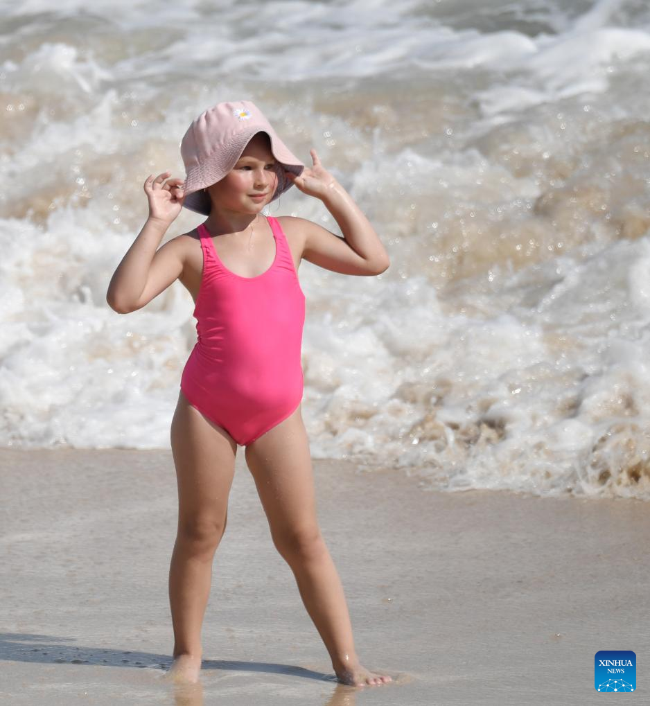 A kid plays at the beach at the Dadonghai scenic area in Sanya, south China's Hainan Province, Sept. 8, 2024. All tourism, cultural and sports venues in Sanya, a tourist city in south China's island province of Hainan, reopened to the public on Sunday as the influence of Super Typhoon Yagi continues to wane, local authorities said. (Xinhua/Zhao Yingquan)