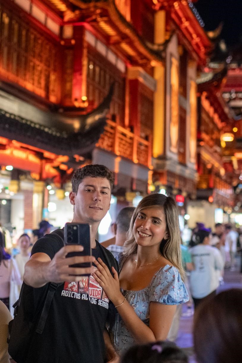 Two foreign tourists pose for a picture in Yuyuan Garden, east China's Shanghai, July 9, 2024. (People's Daily Online/Weng Qiyu)