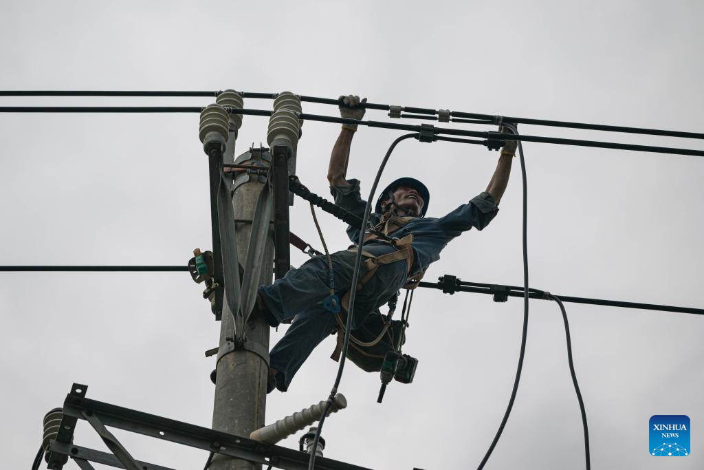 A staff member from a local power company repairs electrical facilities in Chengmai County, south China's Hainan Province, Sept. 9, 2024. Emergency response workers are busy fixing power supply facilities in Chengmai after Super Typhoon Yagi, the strongest autumn typhoon to land in China since 1949, hit Hainan on Friday. (Xinhua/Pu Xiaoxu)