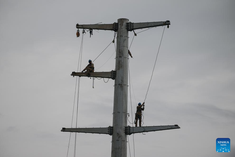 Staff members from a local power company repair electrical facilities in Chengmai County, south China's Hainan Province, Sept. 9, 2024. Emergency response workers are busy fixing power supply facilities in Chengmai after Super Typhoon Yagi, the strongest autumn typhoon to land in China since 1949, hit Hainan on Friday. (Xinhua/Pu Xiaoxu)
