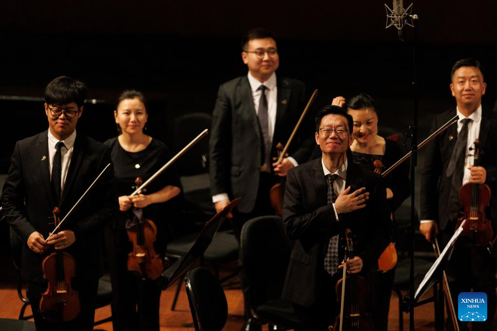 China National Symphony Orchestra's concertmaster, violinist Yao Liang (R, front), acknowledges the audience after performance at the Municipal Theater of Rio de Janeiro, Brazil on Sept. 9, 2024. (Photo by Claudia Martini/Xinhua)