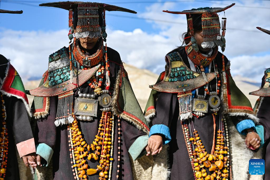Villagers dressed in folk costume dance in Kejia Village of Pulan County, southwest China's Xizang Autonomous Region, Sept. 9, 2024. Originating in Pulan County, Pulan folk costume has been a traditional garment worn at celebrations for over a millennium. Weighing more than 20 kilograms, a piece of this unique costume is usually decorated with rare metals and jewels, like gold, silver, beeswax, coral and turquoise. (Xinhua/Sun Ruibo)