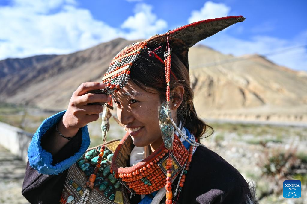 A villager displays folk costume in Kejia Village of Pulan County, southwest China's Xizang Autonomous Region, Sept. 9, 2024. Originating in Pulan County, Pulan folk costume has been a traditional garment worn at celebrations for over a millennium. Weighing more than 20 kilograms, a piece of this unique costume is usually decorated with rare metals and jewels, like gold, silver, beeswax, coral and turquoise. (Xinhua/Sun Ruibo)