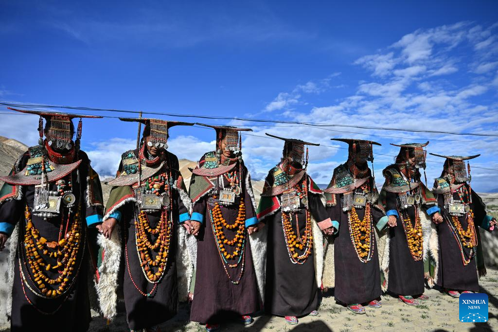 Villagers display folk costume in Kejia Village of Pulan County, southwest China's Xizang Autonomous Region, Sept. 9, 2024. Originating in Pulan County, Pulan folk costume has been a traditional garment worn at celebrations for over a millennium. Weighing more than 20 kilograms, a piece of this unique costume is usually decorated with rare metals and jewels, like gold, silver, beeswax, coral and turquoise. (Xinhua/Sun Ruibo)