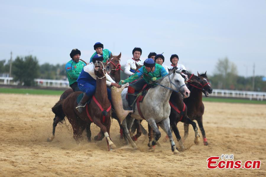 Competitors participate in a sheep-scrambling competition during the 5th World Nomad Games held in Astana, Kazakhstan, Sept. 10, 2024. (Photo: China News Service/Shan Lu)
