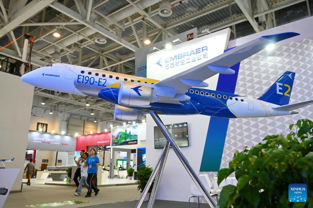 A model of E190-E2 aircraft is on display at the exhibition of BRICS New Industrial Revolution 2024 in Xiamen, southeast China's Fujian Province, Sept. 10, 2024. The BRICS Forum on Partnership on New Industrial Revolution 2024 opened here on Tuesday, with the theme "Fostering high-quality partnership and embarking on a new journey of new industrialization." (Xinhua/Lin Shanchuan)