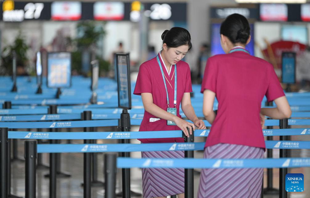 Passengers check in at Haikou Meilan International Airport in Haikou, south China's Hainan Province, Sept. 11, 2024. Hainan has witnessed its production gradually resumed after Super Typhoon Yagi, the 11th typhoon of the year, made landfall in Hainan on Friday and brought damage across the island. (Xinhua/Pu Xiaoxu)