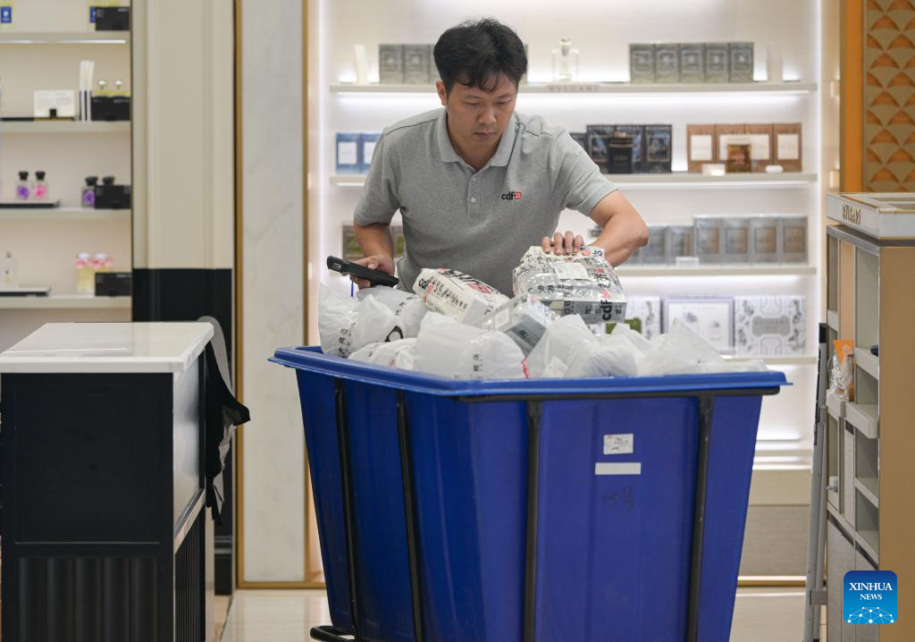 A staff member arranges products at a duty-free store in Haikou, south China's Hainan Province, Sept. 11, 2024. Hainan has witnessed its production gradually resumed after Super Typhoon Yagi, the 11th typhoon of the year, made landfall in Hainan on Friday and brought damage across the island. (Xinhua/Pu Xiaoxu)