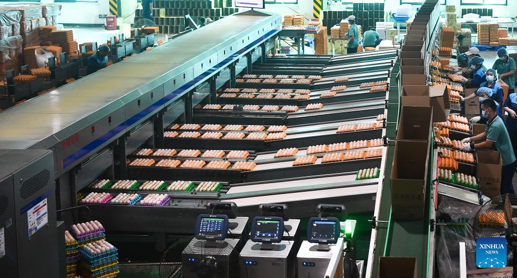 Workers pack eggs at an animal husbandry company in Chengmai County of south China's Hainan Province, Sept. 9, 2024. Hainan has witnessed its production gradually resumed after Super Typhoon Yagi, the 11th typhoon of the year, made landfall in Hainan on Friday and brought damage across the island. (Xinhua/Yang Guanyu)