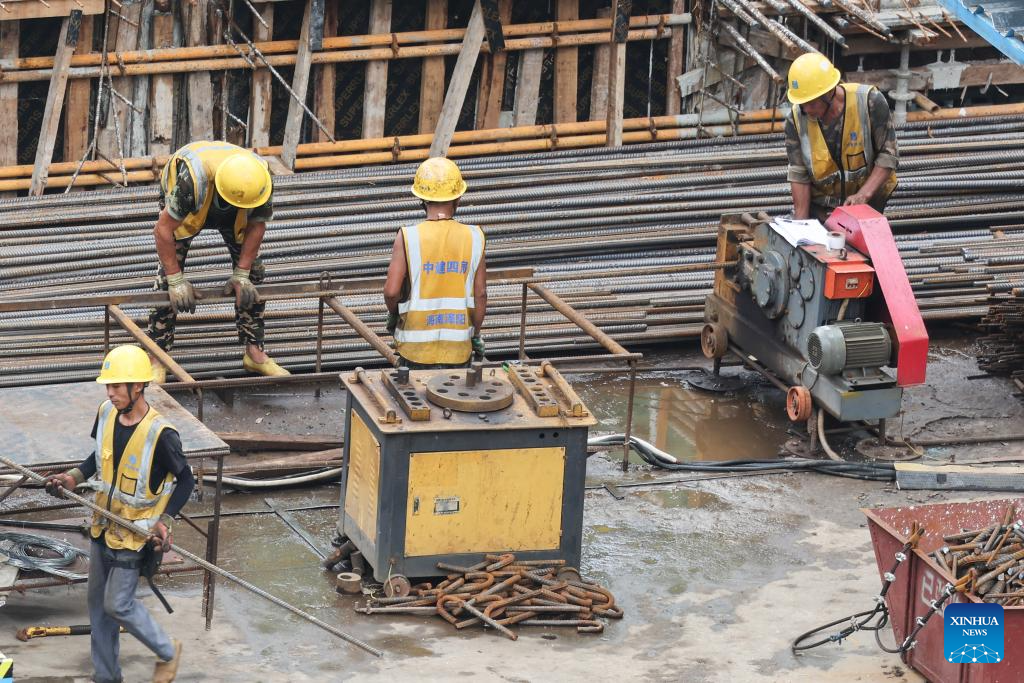 Workers work at a construction site in Haikou, south China's Hainan Province, Sept. 11, 2024. Hainan has witnessed its production gradually resumed after Super Typhoon Yagi, the 11th typhoon of the year, made landfall in Hainan on Friday and brought damage across the island. (Xinhua/Zhang Liyun)