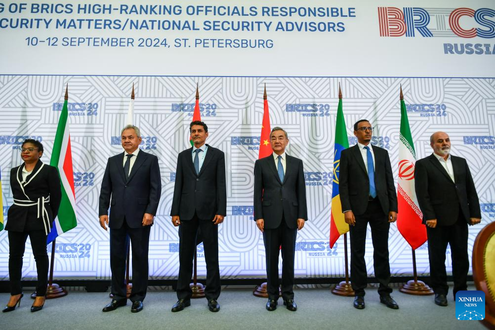Wang Yi, a member of the Political Bureau of the Communist Party of China Central Committee and director of the Office of the Central Commission for Foreign Affairs, attends the 14th meeting of the BRICS high-ranking officials responsible for security matters and national security advisors in St. Petersburg, Russia, Sept. 11, 2024. (Xinhua/Cao Yang)
