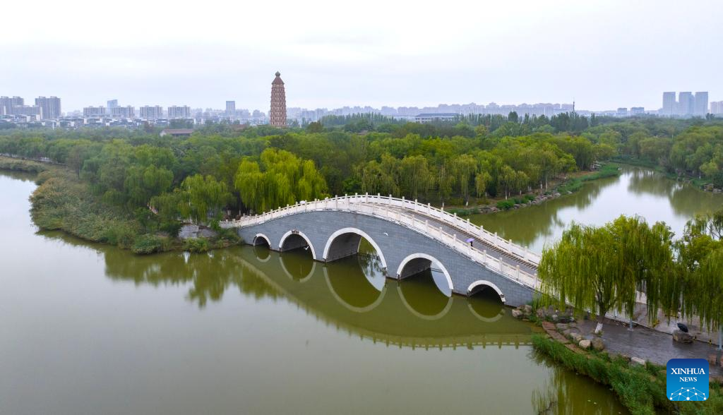 An aerial drone photo taken on Sept. 10, 2024 shows the scenery in Haibao park of Yinchuan, northwest China's Ningxia Hui Autonomous Region. (Xinhua/Yang Zhisen)