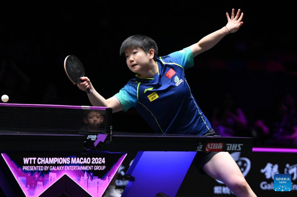 Sun Yingsha of China hits a return during the women's singles round of 16 match between Sun Yingsha of China and Kim Nayeong of South Korea at the 2024 World Table Tennis (WTT) Champions Macao in Macao, south China, Sept. 11, 2024. (Xinhua/Cheong Kam Ka)