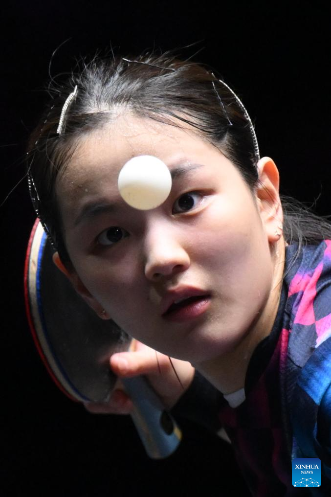 Kim Nayeong of South Korea serves during the women's singles round of 16 match between Sun Yingsha of China and Kim Nayeong of South Korea at the 2024 World Table Tennis (WTT) Champions Macao in Macao, south China, Sept. 11, 2024. (Xinhua/Cheong Kam Ka)
