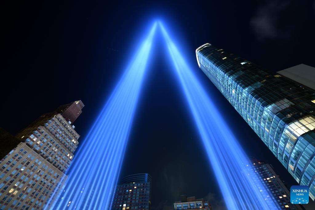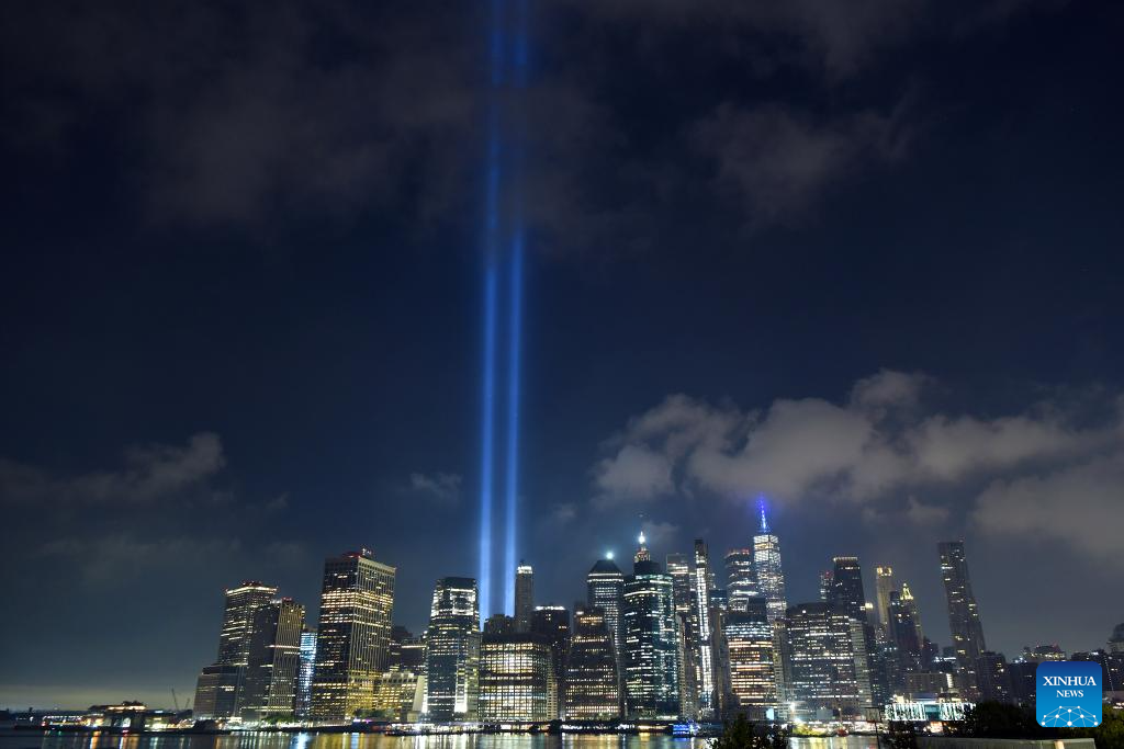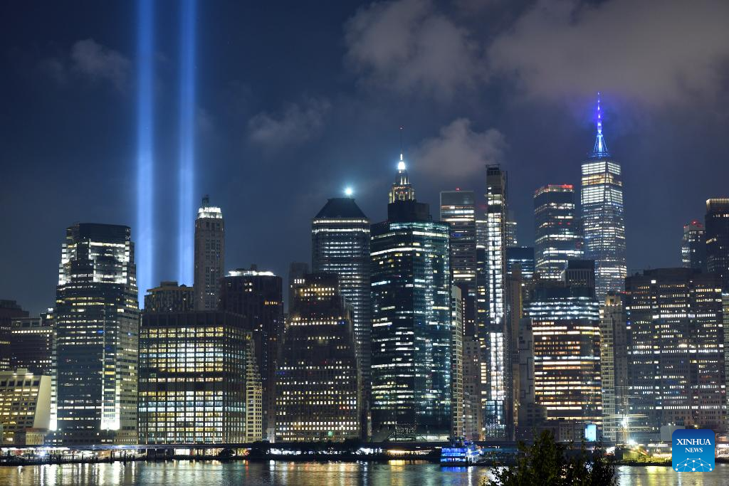 The Tribute in Light, an art installation of searchlights to create two vertical columns of light to represent the Twin Towers, is seen to mark the 23rd anniversary of the 9/11 attacks in New York, the United States, on Sept. 11, 2024. (Xinhua/Li Rui)