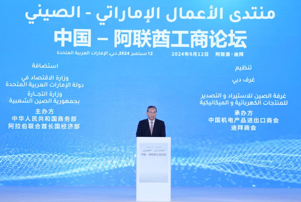 DUBAI, Sept. 12 (Xinhua) -- Chinese Premier Li Qiang on Thursday called on enterprises from China and the United Arab Emirates (UAE) to seize new cooperation opportunities through the continued and steadfast mutual efforts of both countries.